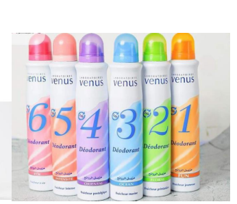 انتعاش يدوم 24 ساعة مع بخاخ مزيل الروائح من فينوس. روائح فريدة تناسب شخصيتك وتمنحك ثقة تامة طوال اليوم. اكتشف مجموعتك المفضلة الآن!